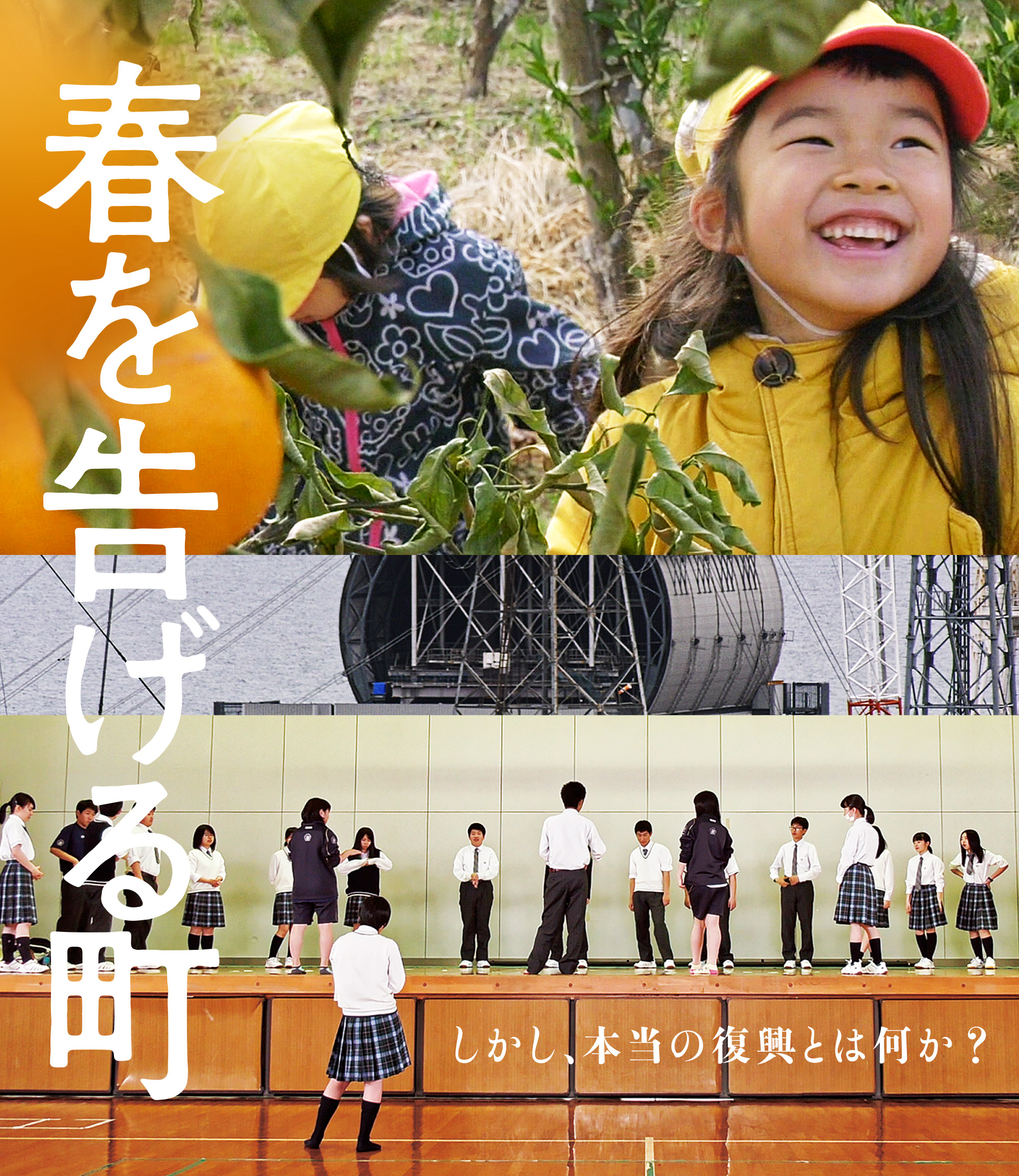 『春を告げる町』が描くのは、華やかでシンボリックなセレモニーの後景で、こつこつと日々の暮らしを築いていく人びとの営み。この土地で新たに生まれ、すくすくと育っていく子どもたちの物語。被災体験をモチーフに演劇をつくりあげる高校生たちの青春。広野町を流れるいくつもの時間が交差し、重なりあい、やがて未来をかたちづくっていく。